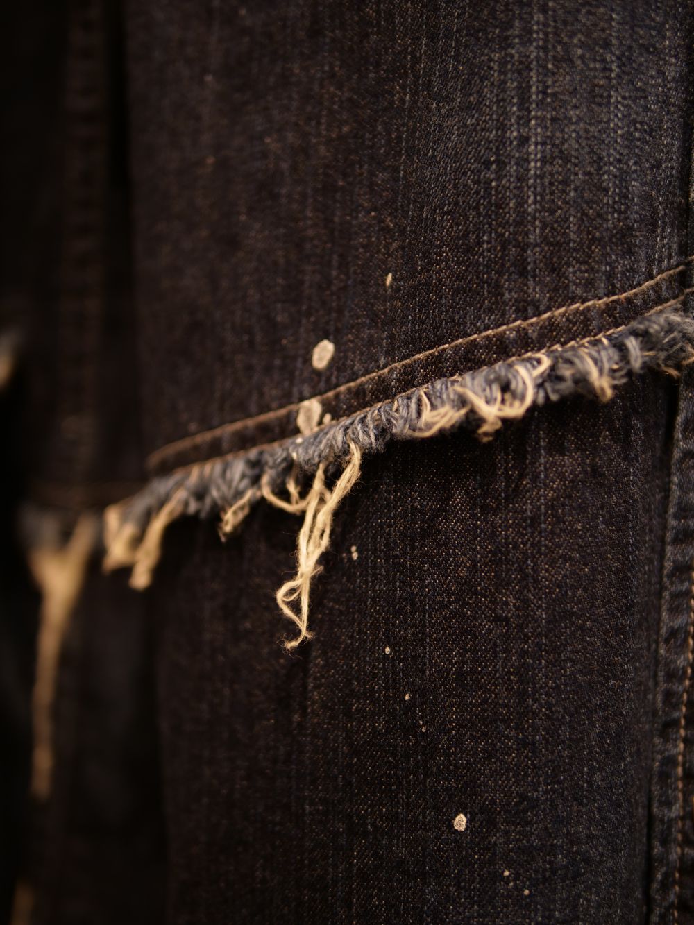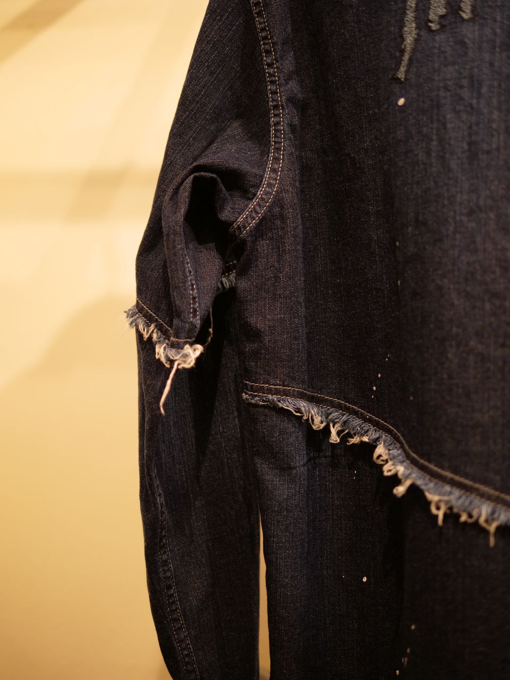 こちらの作品は独特なカッティングが施されていて、縫い代の端っこはあえて切りっぱなしにする事により布が端の方から糸状に飛び出し、デザインのアクセントに。