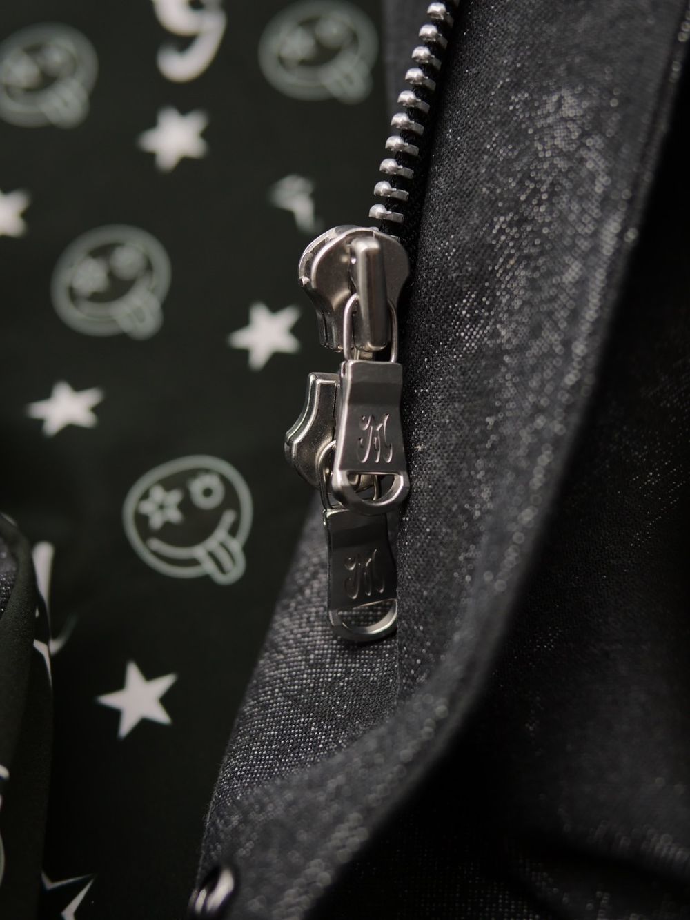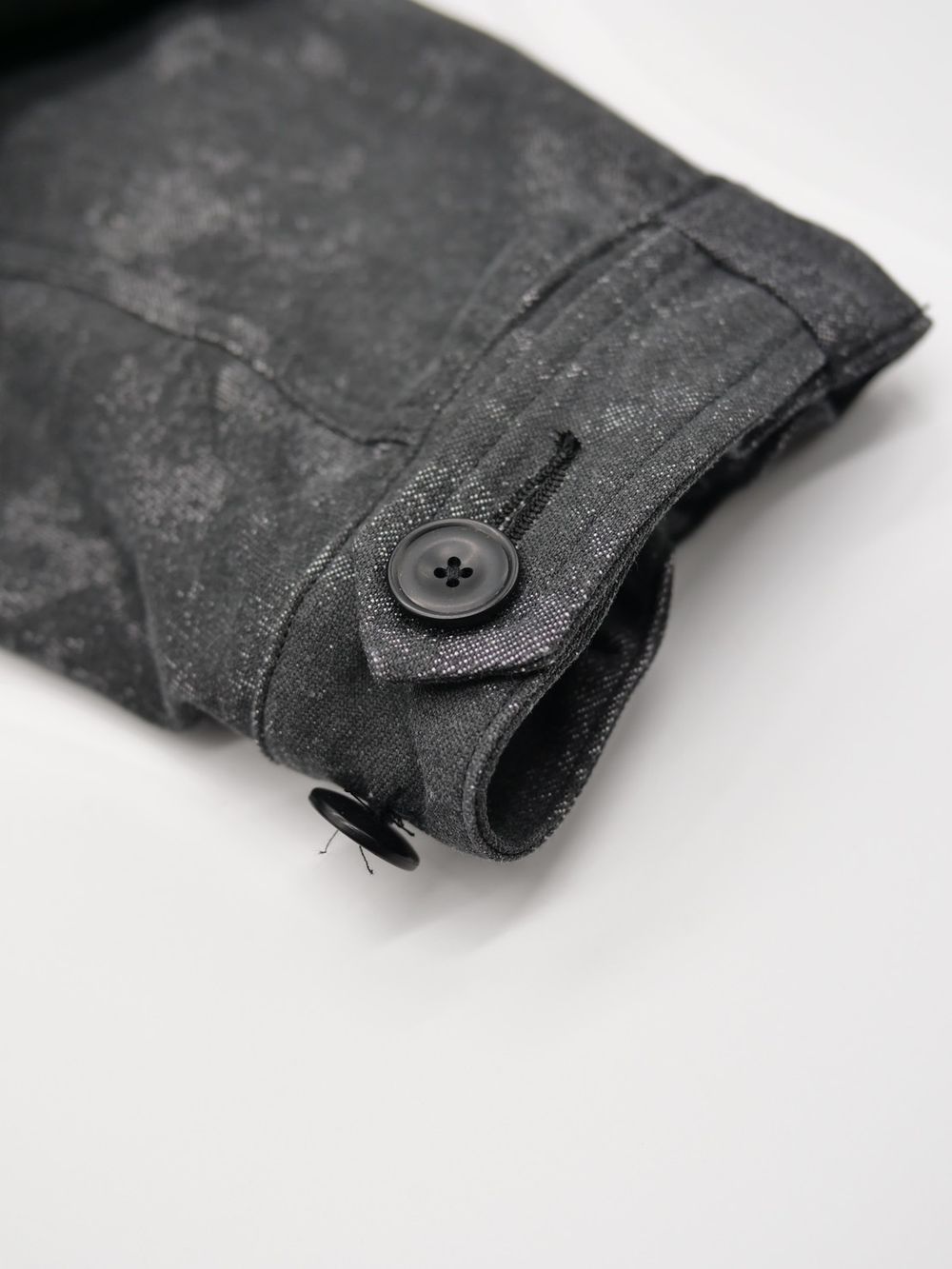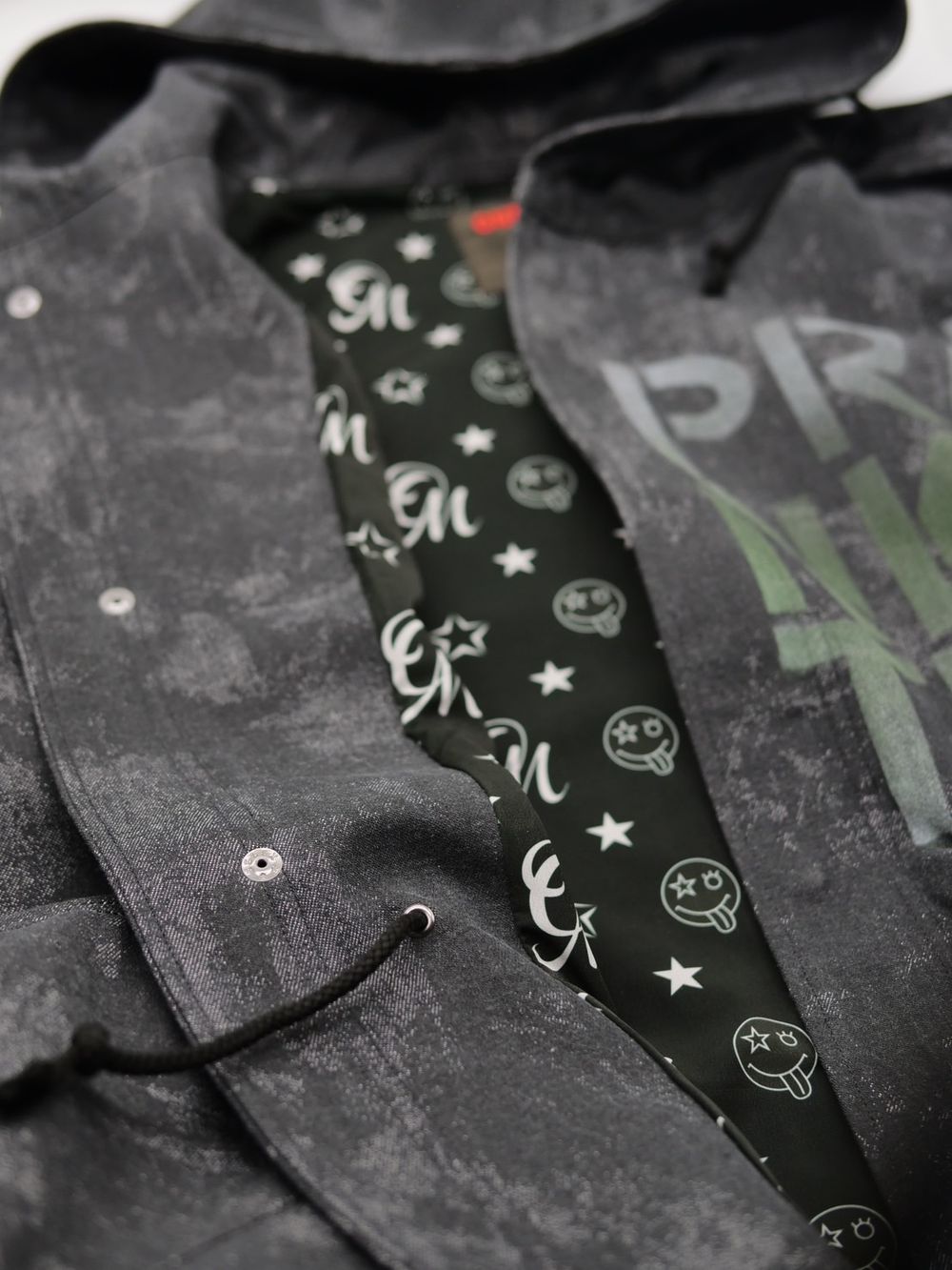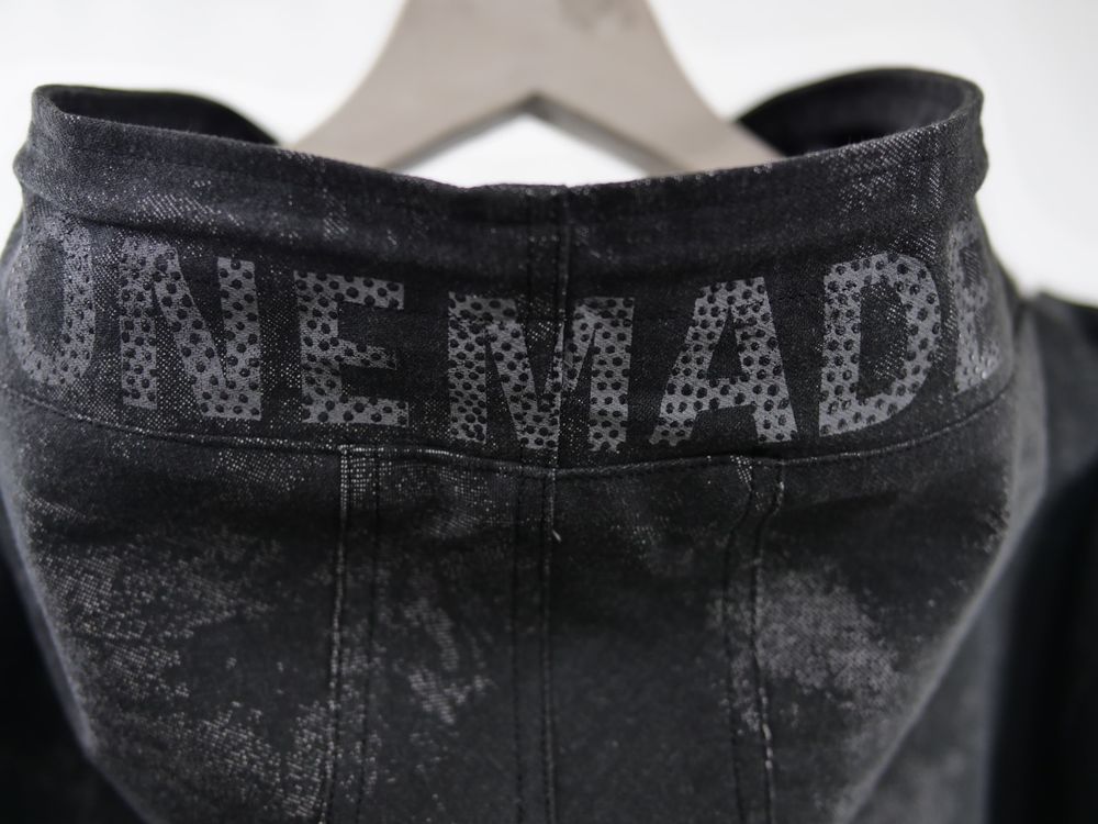 デニム生地をブリーチで色を抜いた後に黒染めを施し、その上から黒いプリントを追加。これにより、唯一無二の深みある表情が生まれる。