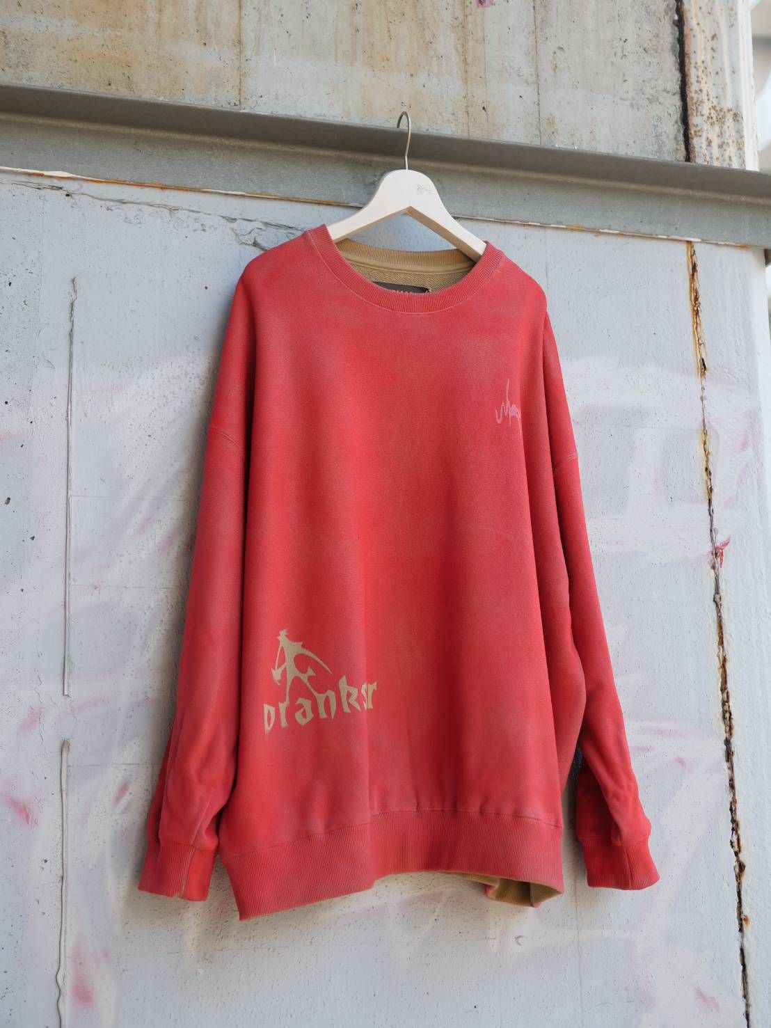 前身頃右下部には「DRANKSTER」と記されたプリントが。これはアートの世界でよく使われる「ひねくれ者」という意味を持つ言葉。「ひねくれ者」とは、他者と同じことをせず、自分だけの表現方法を追求する優れたクリエイターを指す言葉です。まさにこのトレーナーが体現するコンセプトです。