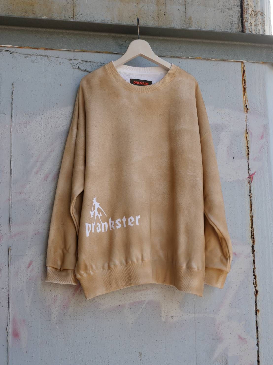 「ひねくれ者=DRANKSTER」というアートなメッセージと、従来の染色にはない特殊スプレー技法が生み出す質感。そして、大人が楽しめる計算されたBOXシルエット。まさにONEMADEらしい、“他とは違う”大人のためのアートトレーナーです。
