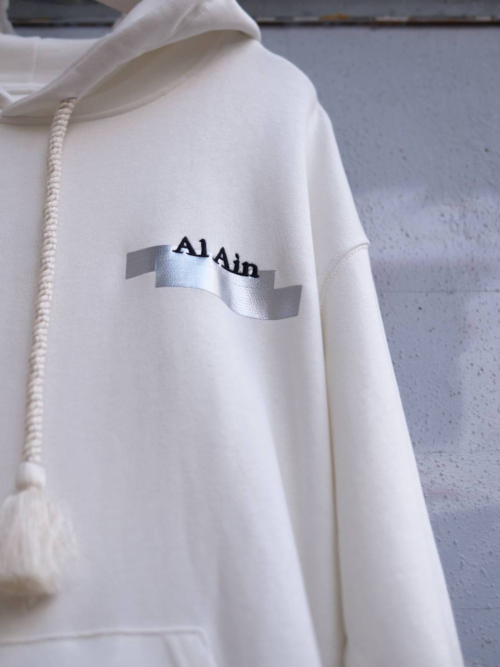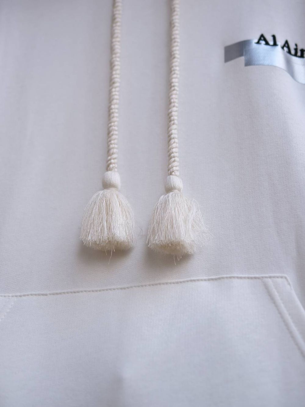 左胸には リフレクタープリント+Alain刺繍 を施し、大人の着こなしにもマッチ。フード紐は一般的なスピンドルコードではなく、センスある フリンジ付き。軽やかな見た目ながら、存在感のあるデザインでシンプルなコーディネートにも映える。