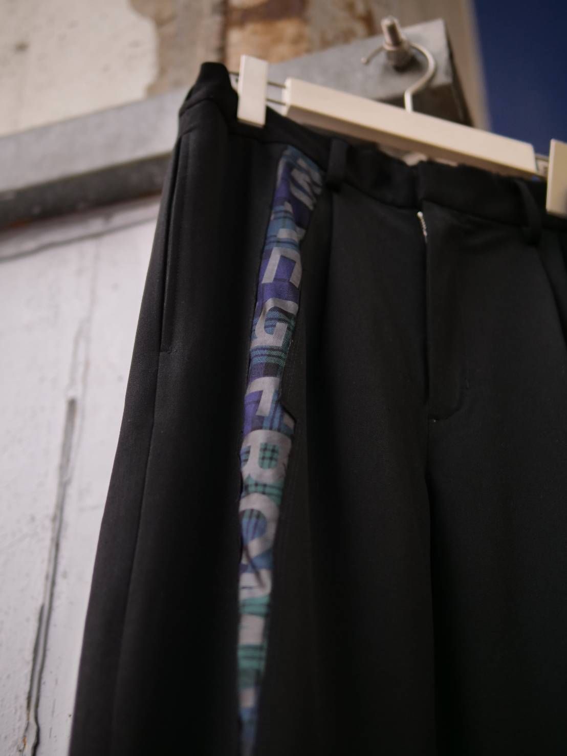 このパンツの最大の特徴は、黒のミニマルな構築美の中に、緑のチェック柄を挟み込んだデザイン。まるで絵画のレイヤーを重ねるように、黒の中からふと覗くチェック柄が、「ただのシンプル」を超えた奥行きを生み出します。
