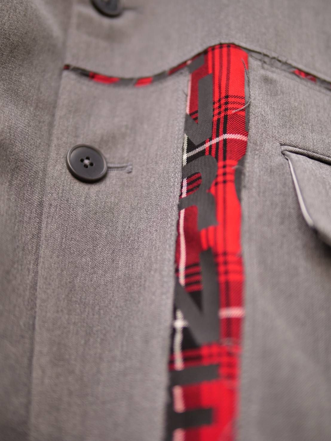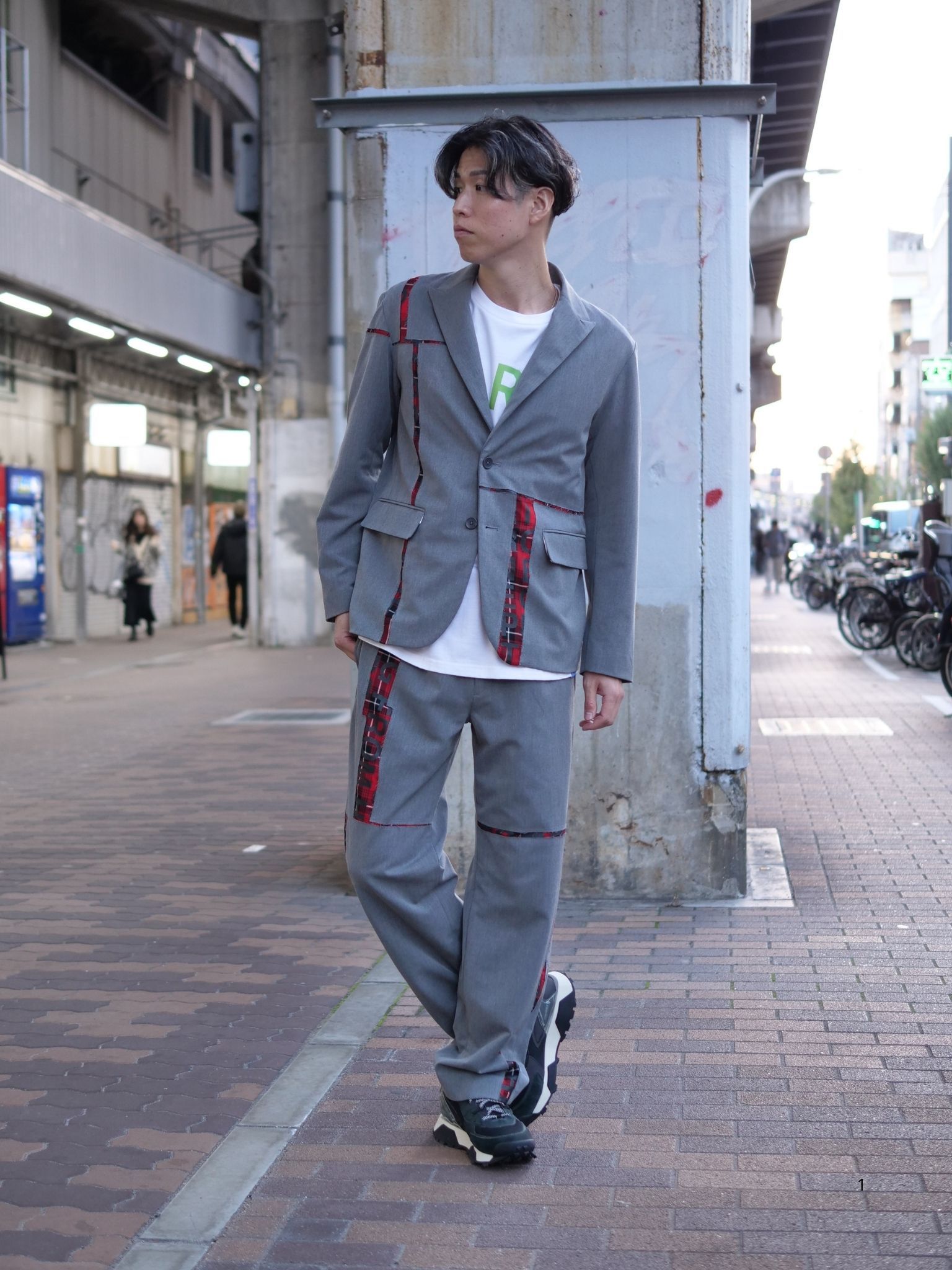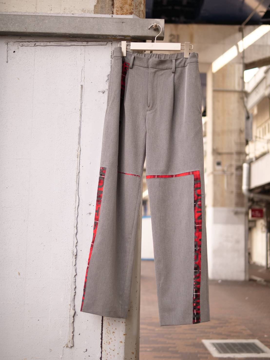 このセットアップ最大の特徴は、ミニマルなグレーの構築美の中に、赤のチェック柄を挟み込むという独創的なアート表現。まるで絵画のレイヤーを重ねるように、落ち着いた灰色の中からふと覗く赤が、「シンプルを超えたシンプル」とも言える奥行きを生み出します。