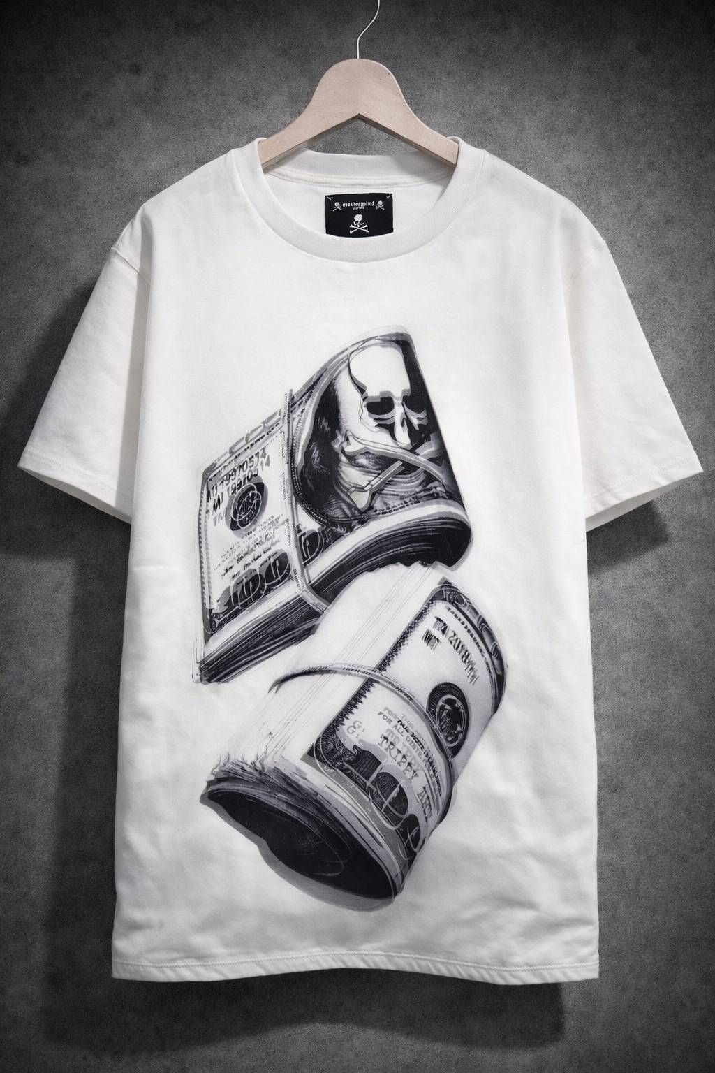 2枚のドル札をモチーフに構成された、象徴的なデザイン。タイトルは、その名も 「$1,000」。上段のドル札には、mastermind JAPANを象徴するスカルアイコンを配置。札を束ねる帯や数字のディテールには、さりげない隠しデザインが忍ばされています。よく見ると、数字にはmastermindの生年月日、