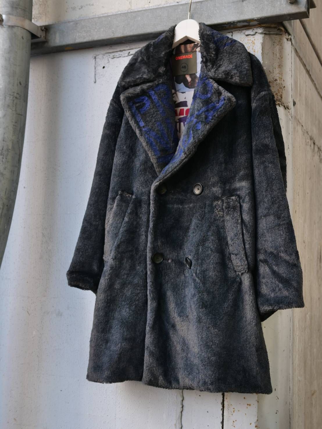 メッセージは、 MIKIO氏自身の手によるステンシルスプレープリント。 スプレーインクが長い毛足のファーを寝かせることで、 凹凸のある立体的な表情が生まれます。 プリントでありながら、 見る角度によって表情が変わる立体的な仕上がり。 一点一点異なる表情は、 手作業だからこそ生まれる価値です。