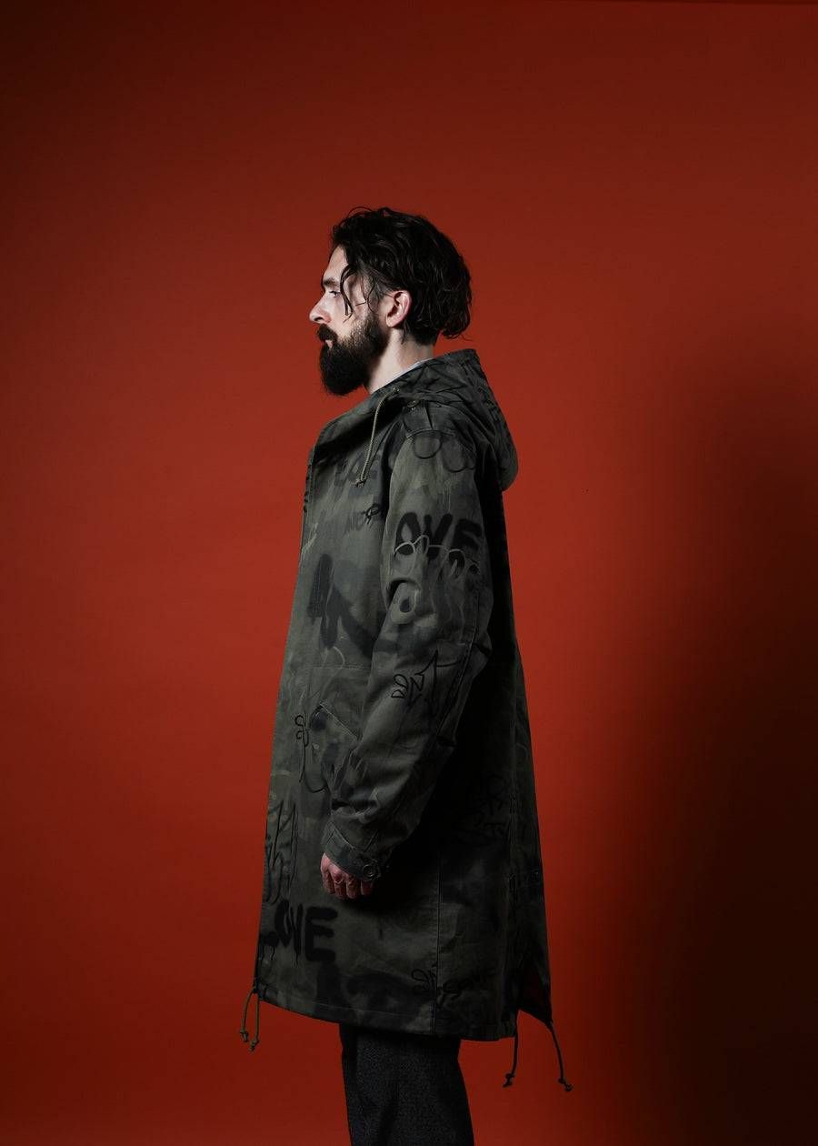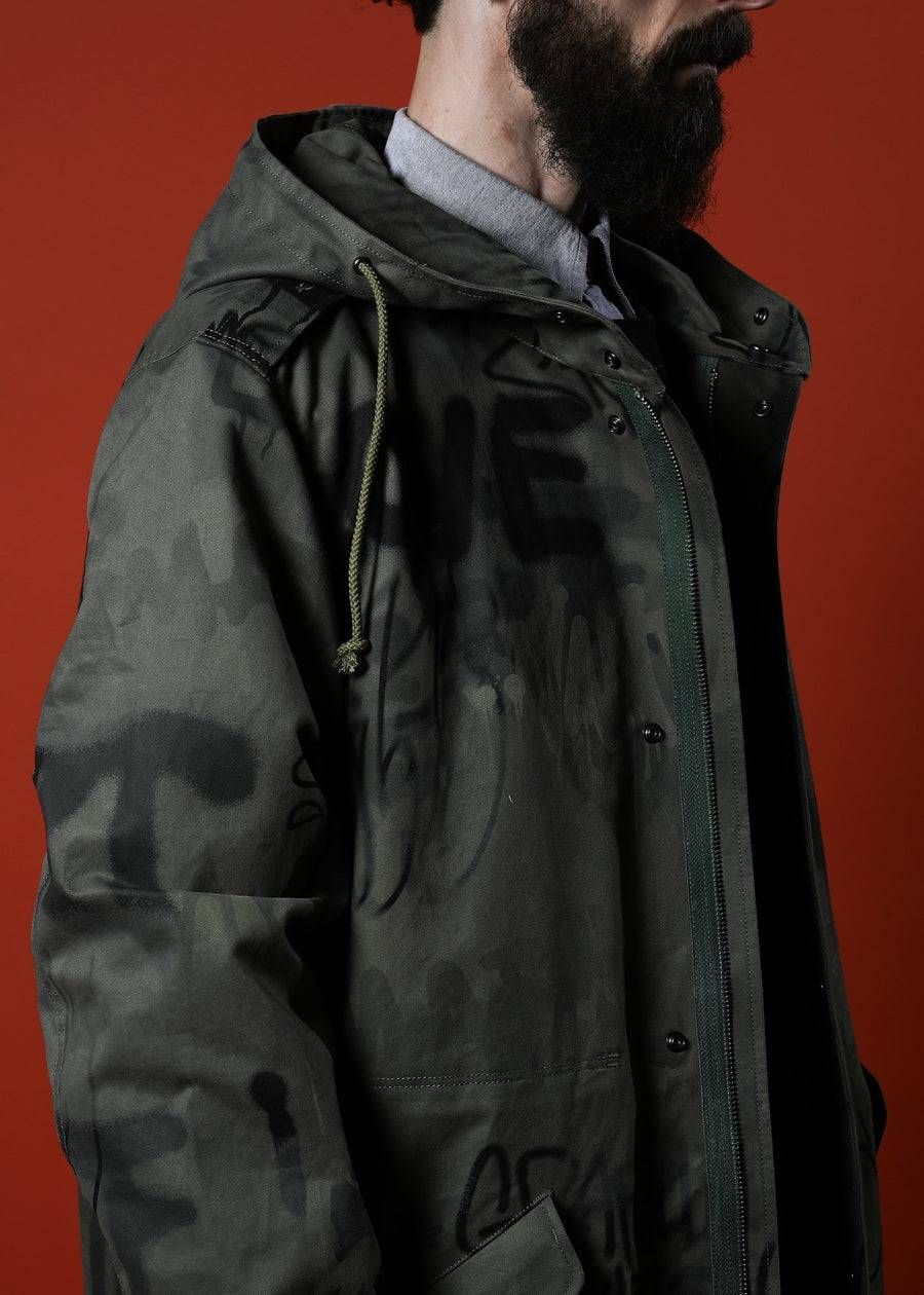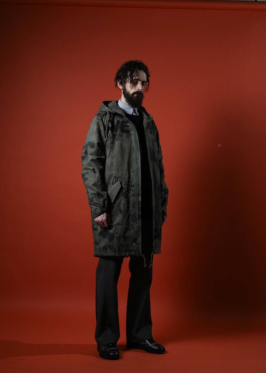 完成度の高いクラシックなモッズコートに、MIKIO氏がスプレーで描いた原画をもとにした特殊プリントを採用。量産的なデザインでは表現できない、深みと奥行きを感じさせる一着です。