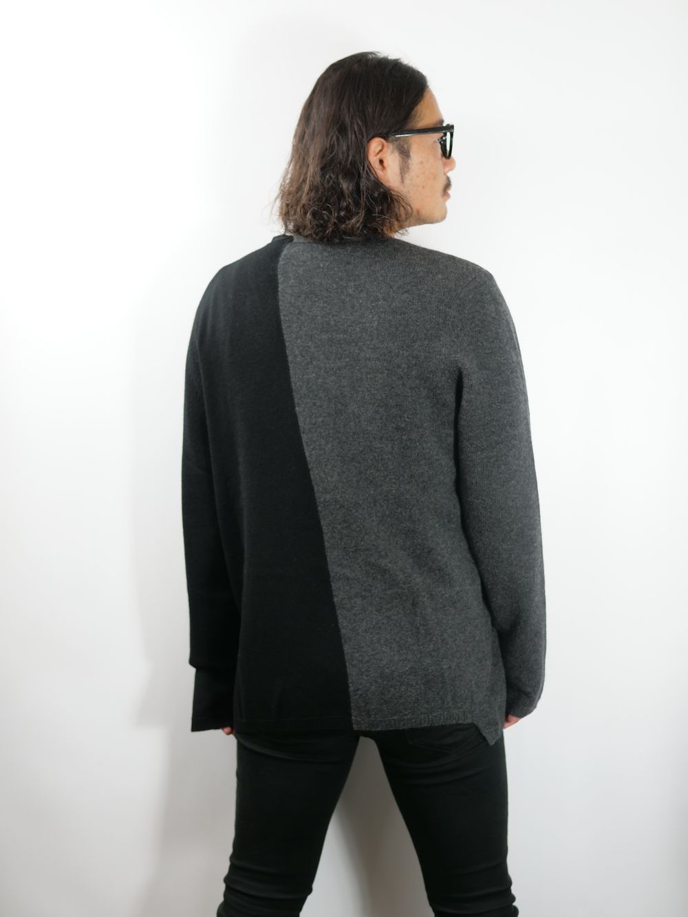 左右非対称になっていて全く異なる2つのニットを組み合わせたアートな作品です。