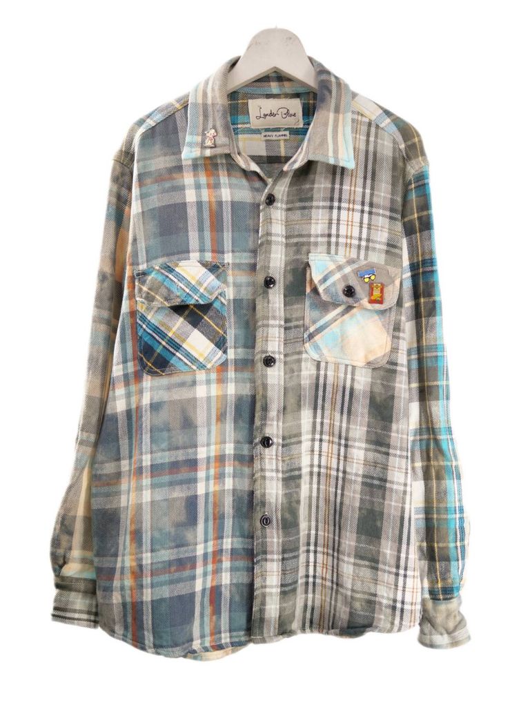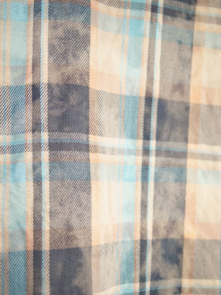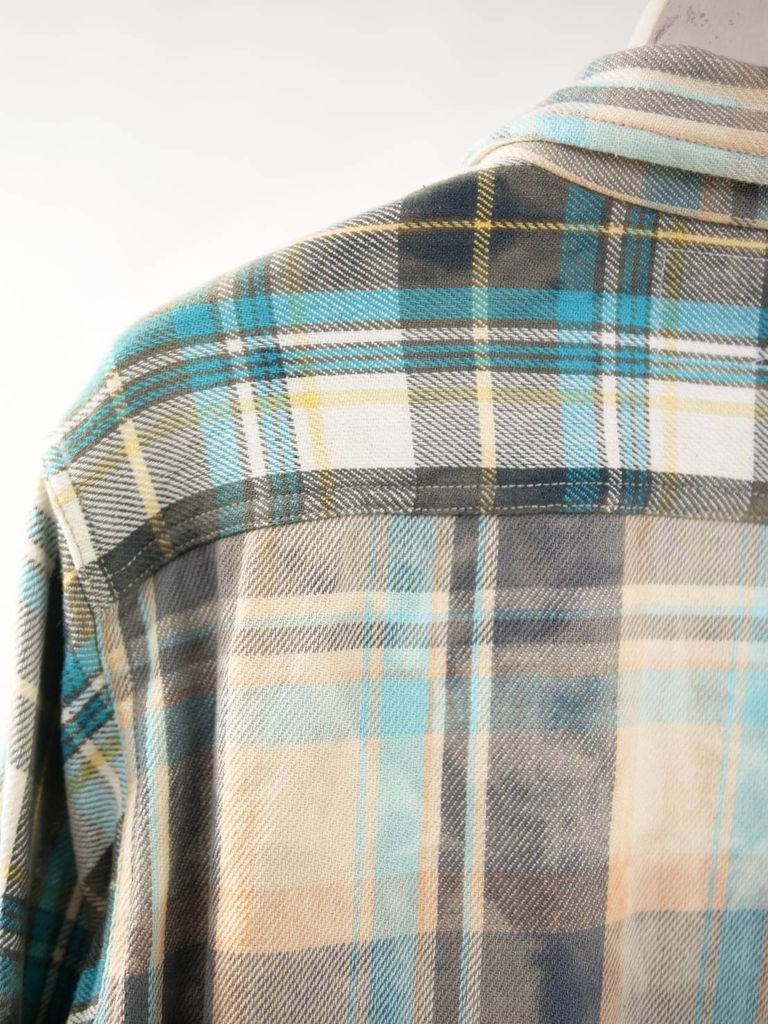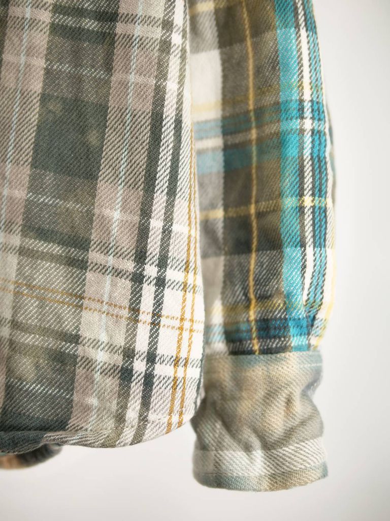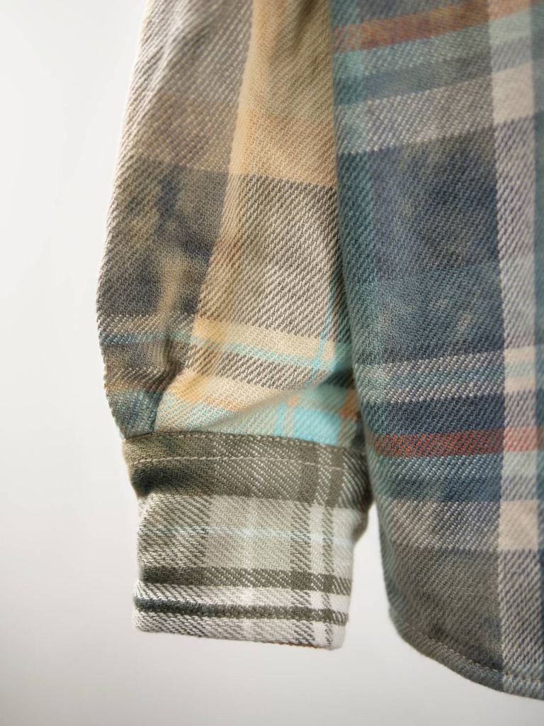 異なるチェック柄をパズルのように組み合わせた、LANDERBLUEならではのチェックシャツ。さらに完成後にタイダイ染めを施すことで、長年着込んだような深みのある風合いを表現しています。