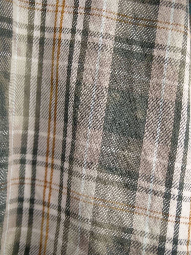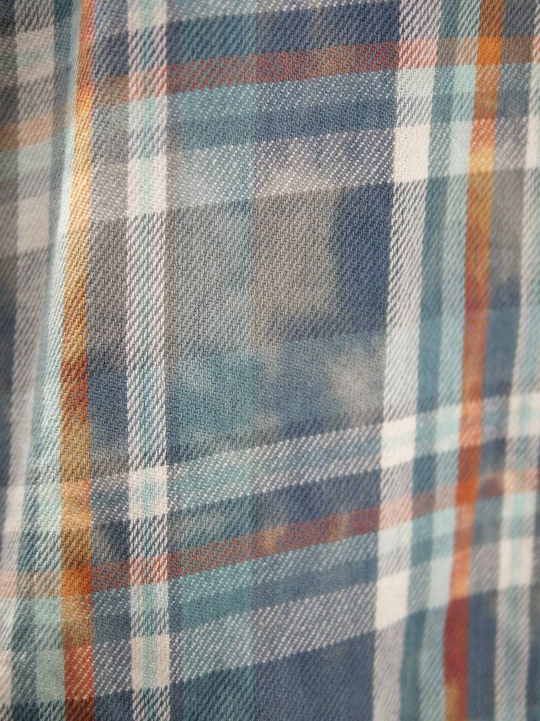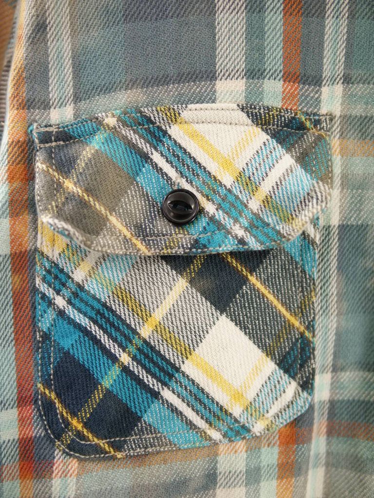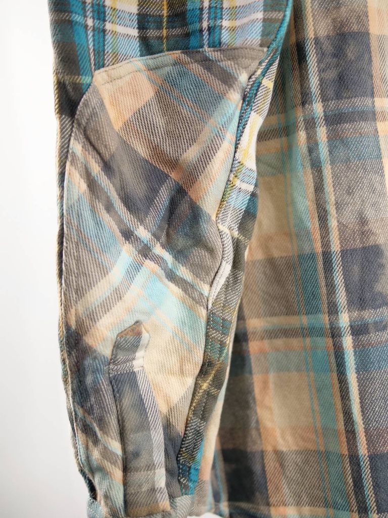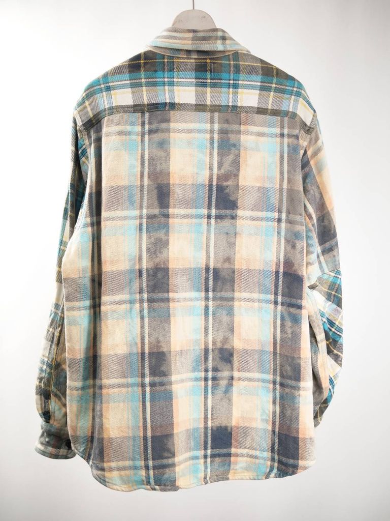 異なるチェック柄をパズルのように組み合わせた、LANDERBLUEならではのチェックシャツ。さらに完成後にタイダイ染めを施すことで、長年着込んだような深みのある風合いを表現しています。