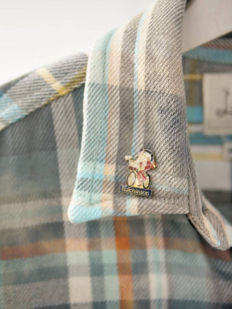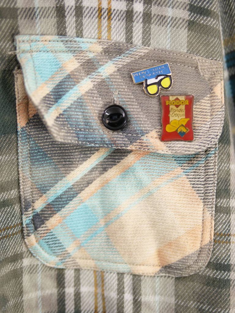 襟元や胸元には、1950〜1990年代のヴィンテージピンバッチを配置。一点ごとに異なるデザインが採用されており、手に取るたびに違った表情を楽しめます。
