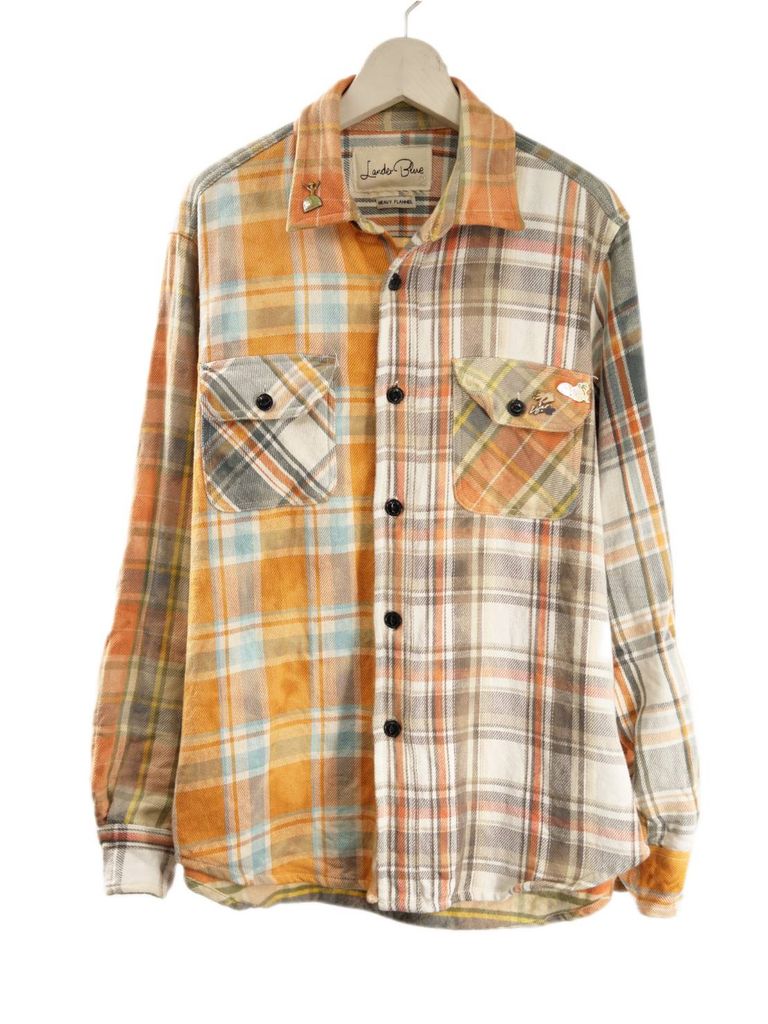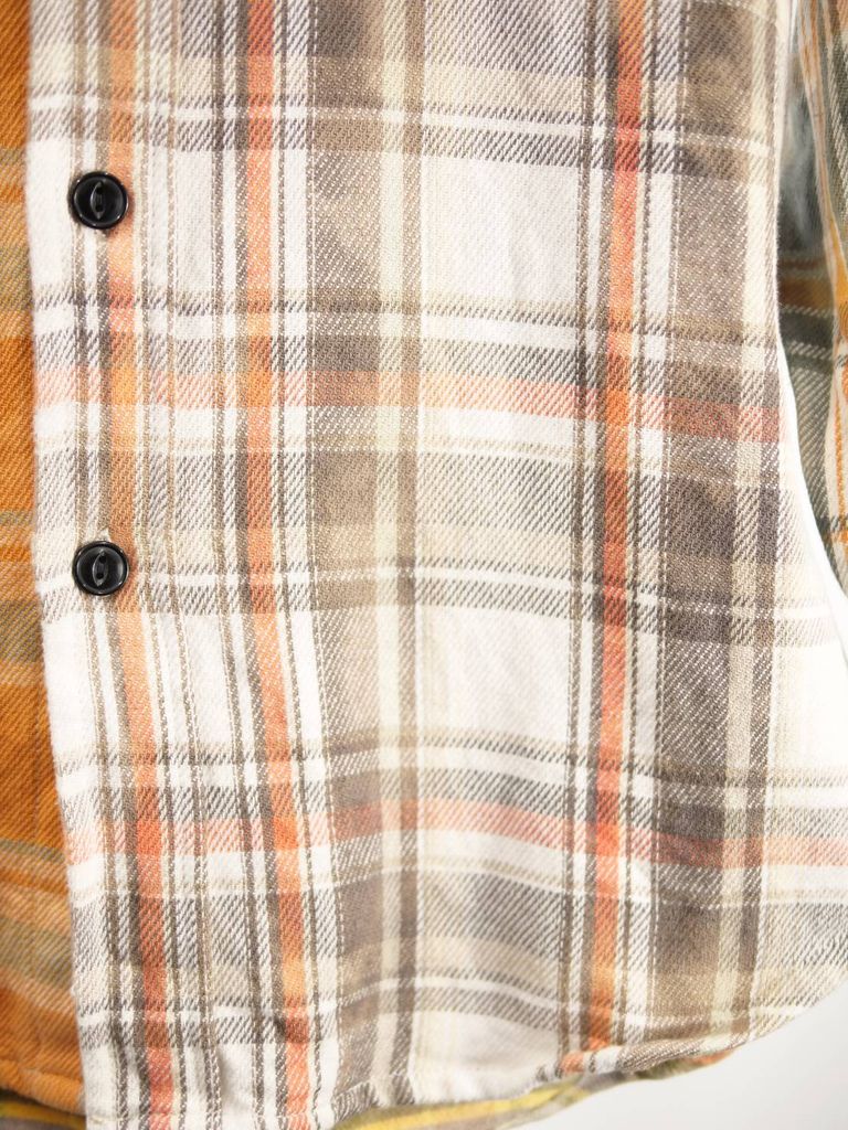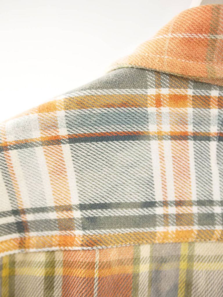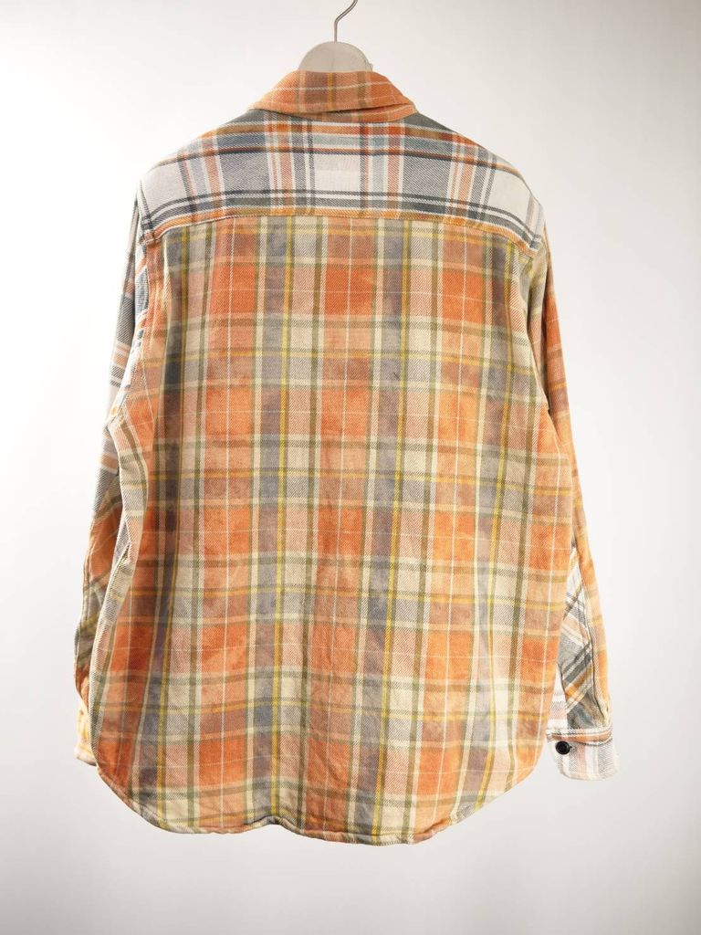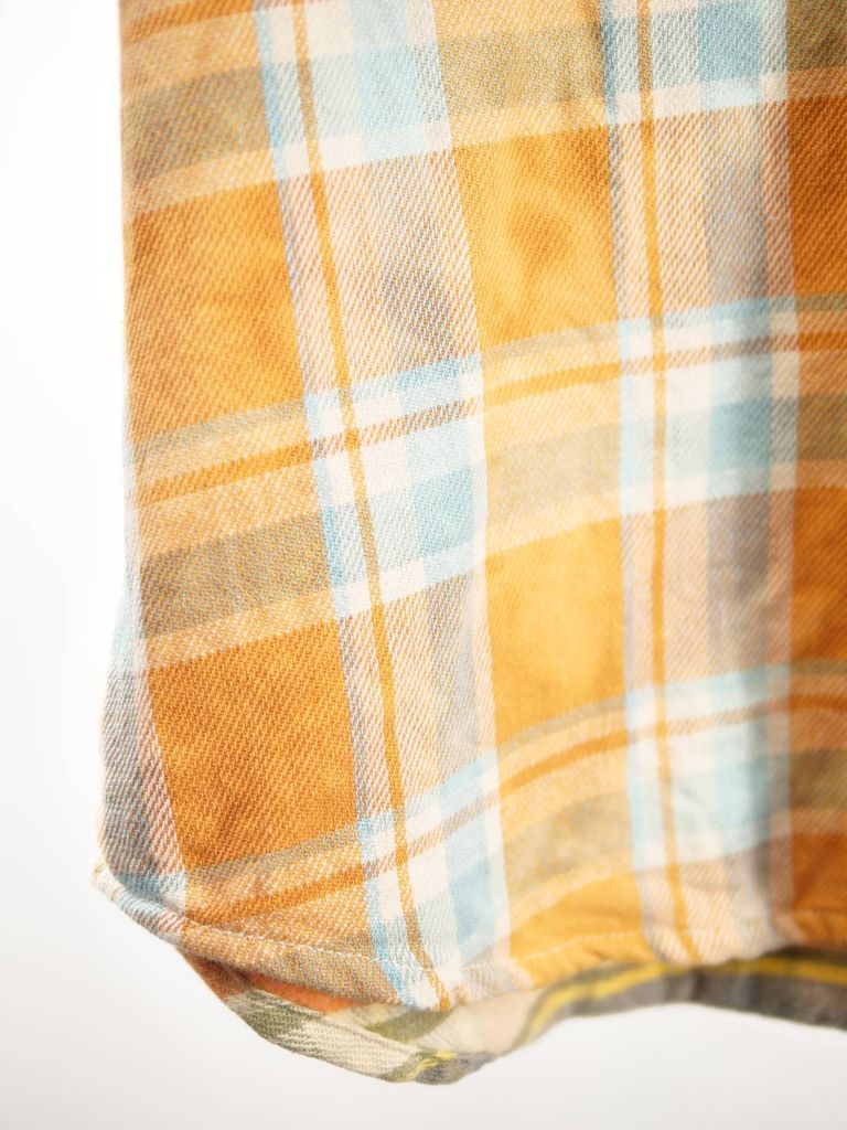 異なるチェック柄をパズルのように組み合わせた、LANDERBLUEならではのチェックシャツ。さらに完成後にタイダイ染めを施すことで、長年着込んだような深みのある風合いを表現しています。