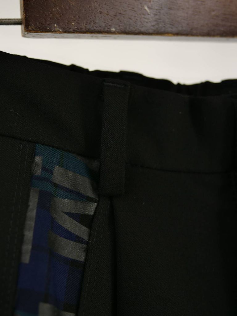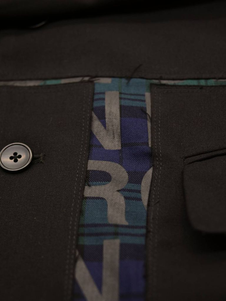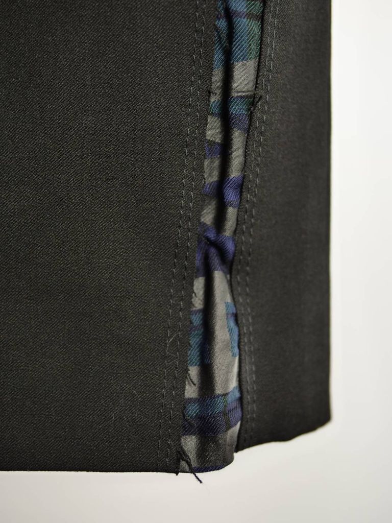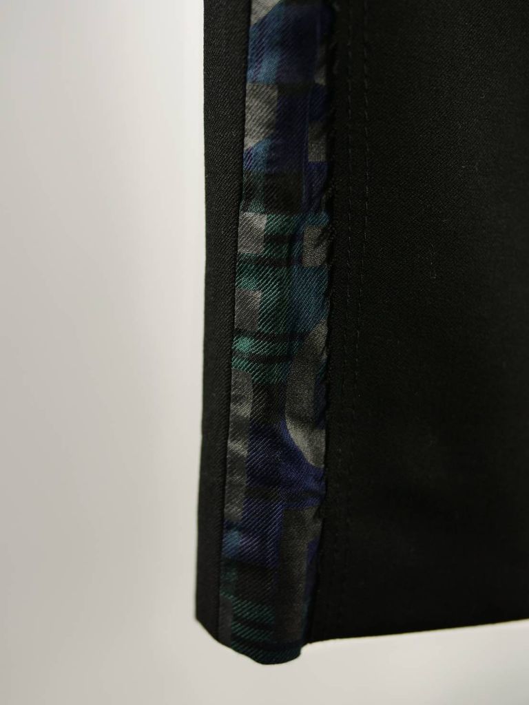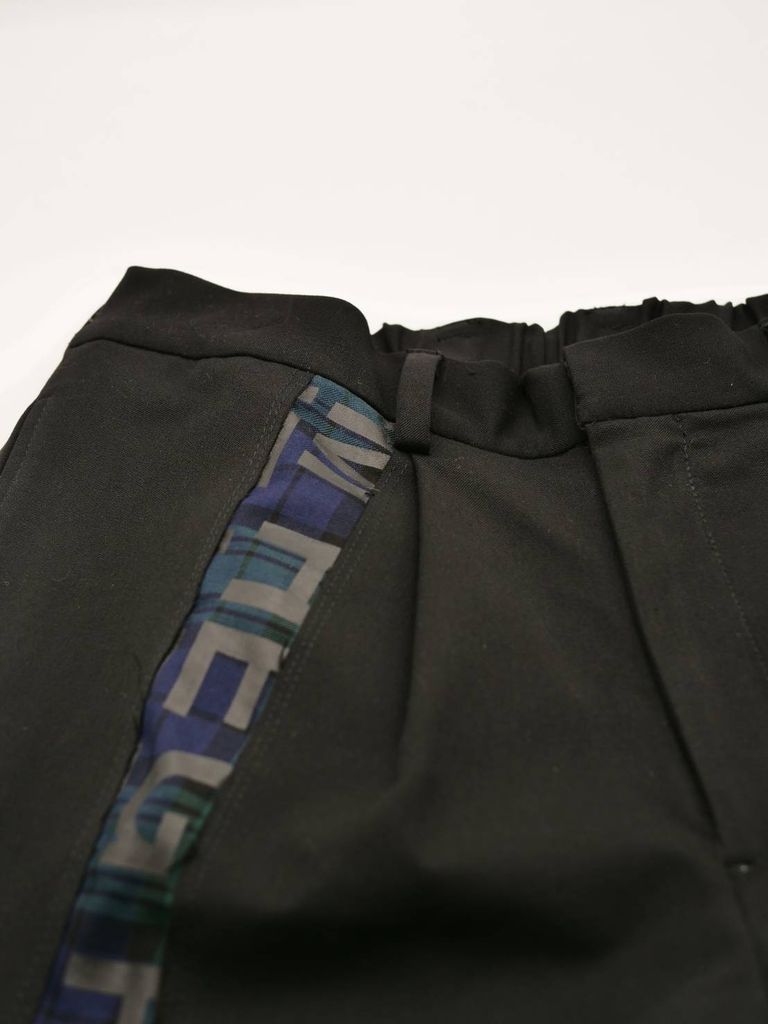 特徴的なのは、1つずつハンドプリントされたチェック柄をスラックスの構造の中に挟み込み、丁寧に縫い上げたデザイン。手作業でしか出せないプリントのムラやかすれが、唯一無二の温度と表情を生み出します。量産では決して再現できない、アートの息づく一着です。