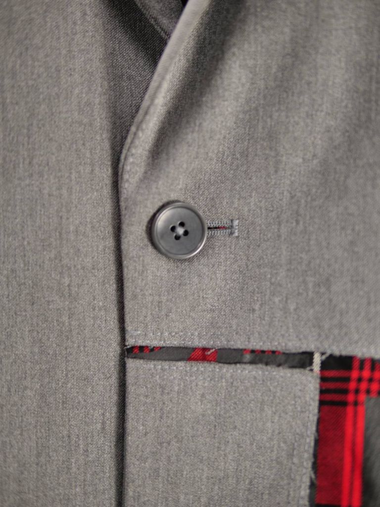 特徴的なのは、1つずつハンドプリントされたチェック柄をテーラードの構造の中に挟み込み、丁寧に縫い上げたデザイン。手作業でしか出せないプリントのムラやかすれが、唯一無二の温度と表情を生み出します。量産では決して再現できない、アートの息づく一着です。