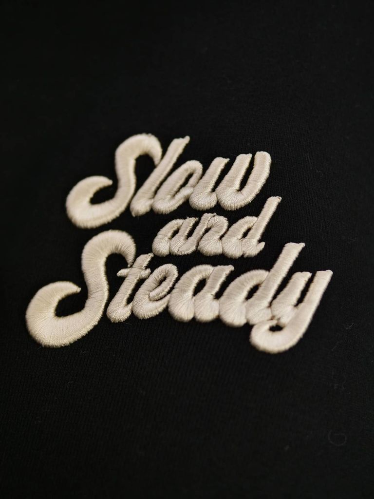 胸元には、ことわざ “Slow & Steady(急がば回れ)” のメッセージを立体刺繍でデザイン。艶のあるレーヨン糸を使用し、見る角度によって輝きを放つ高級感ある仕上がり。「急がず、丁寧に積み重ねる」という想いを込めた、ブランドらしいメッセージ性のある1枚です。